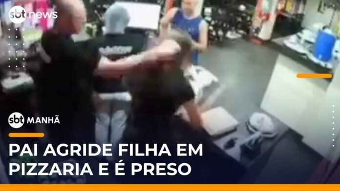O dono de uma pizzaria em Vitória, no Espírito Santo, foi preso em flagrante por agredir a própria filha dentro do estabelecimento. A discussão teria começado por causa de uma desavença entre a jovem e um motoboy. Nas imagens, o homem aparece puxando o cabelo da vítima e desferindo tapas e murros, enquanto ela tenta registrar a cena com o celular. As agressões só cessaram quando um cliente interveio. O agressor foi autuado por lesão corporal, injúria e ameaça.