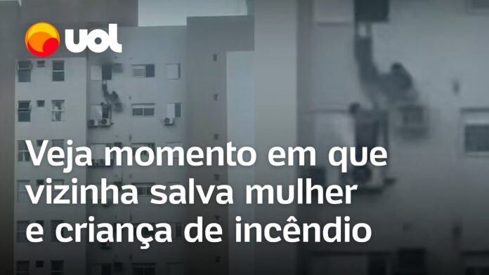 Um incêndio atingiu um apartamento em Cascavel, Paraná, nesta quarta-feira (15). Vídeo mostra momento em que uma vizinha usa tubulação de ar-condicionado para salvar mulher e criança.