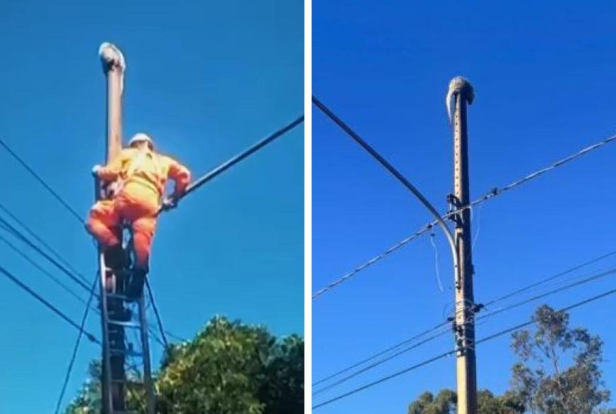 A 11ª Companhia Independente Bombeiro Militar (11ª CIBM) foi acionada por volta das 8h e prontamente uma equipe se deslocou ao local indicado. Ao chegar, os bombeiros constataram que o animal estava em situação de risco, devido a altura e aos fios de eletricidade.